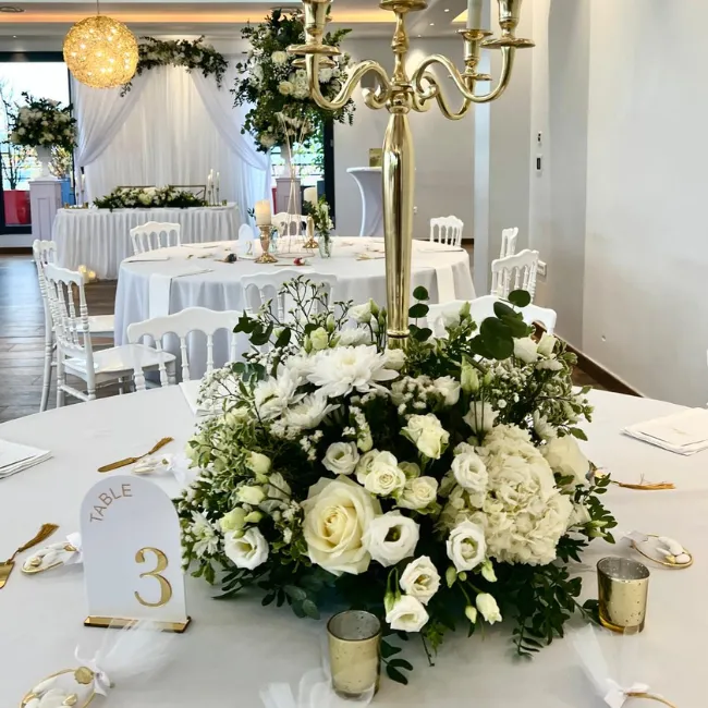 Placée autour d’un chandelier, d’une lanterne ou d’un élément décoratif imposant, cette composition devient une véritable pièce maîtresse. Elle est idéale pour les grandes tables, les tables d’honneur ou les réceptions où la décoration florale joue un rôle central dans la scénographie.