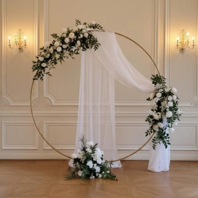 L’arche ronde est l’un des éléments les plus recherchés en décoration de cérémonie et en décoration de mariage. Sa forme circulaire crée un cadre visuel harmonieux, parfait pour mettre en valeur l’échange des vœux ou créer un décor photo impactant. Idéale pour une location d’arche de mariage moderne, romantique ou bohème, elle offre un support élégant pour accueillir fleurs, voilages ou compositions personnalisées.