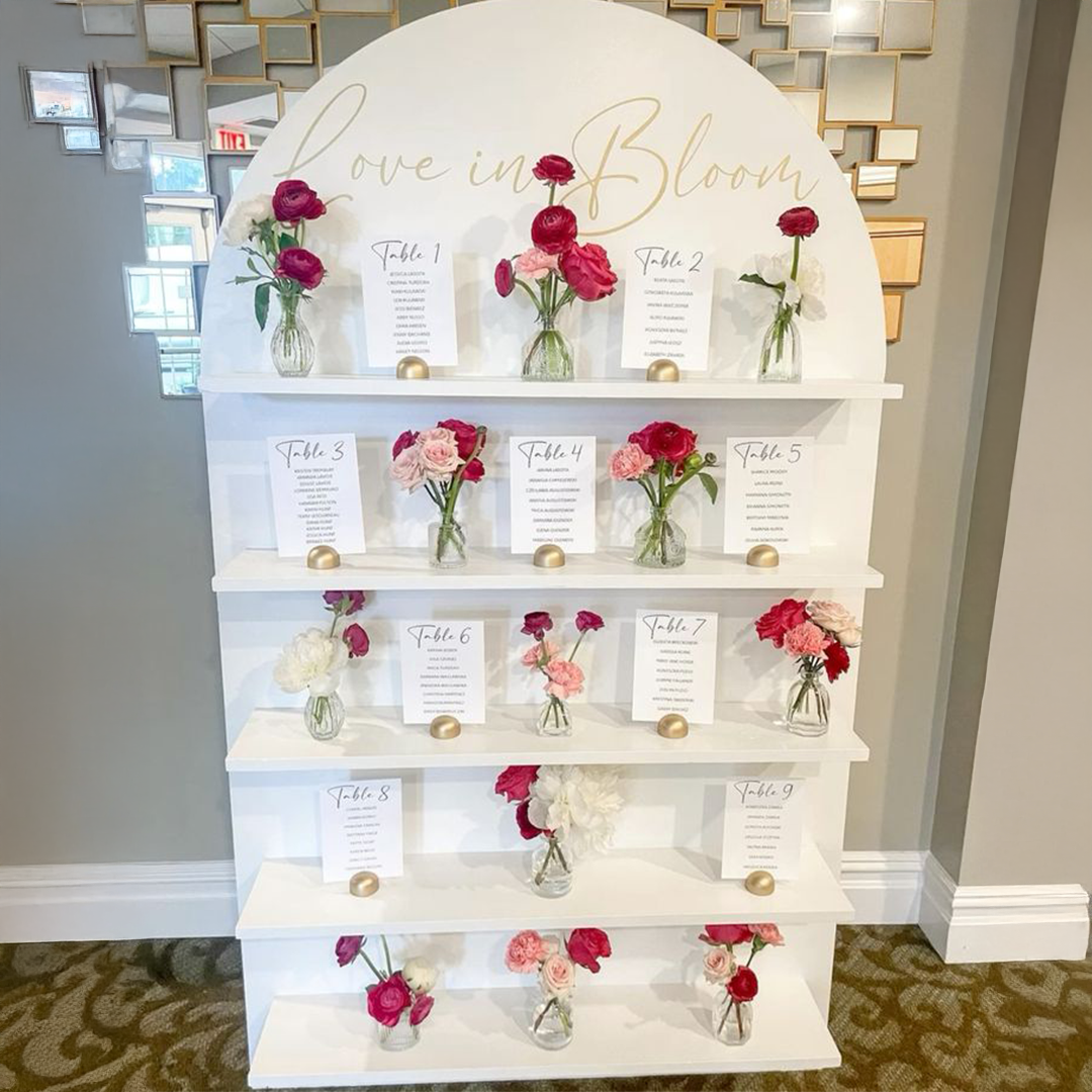 Ce backdrop fleuri offre une mise en scène élégante et moderne pour présenter votre plan de table. Ses étagères blanches décorées de fleurs apportent un effet visuel “waouh”, idéal pour l’entrée de votre salle.