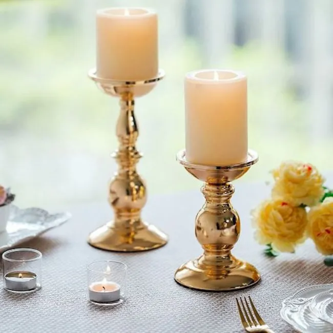 Le bougeoir doré apporte une touche luxueuse et intemporelle à vos tables de réception. Sa silhouette élégante met en valeur la bougie et crée un éclairage chaleureux, idéal pour une ambiance romantique ou festive. Parfait pour les mariages classiques, glamour ou modernes souhaitant un centre de table raffiné.