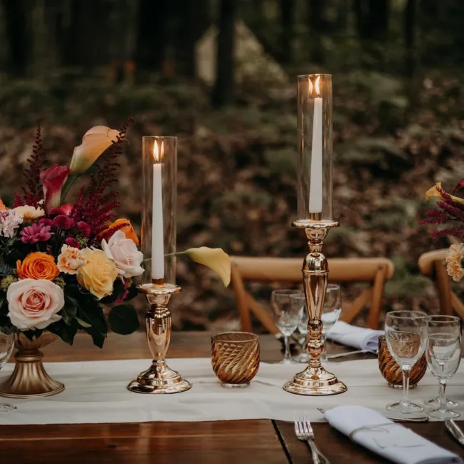 Ces bougeoirs dorés accompagnés de leurs tubes en verre créent un effet lumineux spectaculaire, parfait pour une décoration de mariage haut de gamme. La combinaison métal doré / verre transparent apporte sophistication et modernité, tout en protégeant la flamme pour une ambiance douce et sécurisée. Un véritable atout pour structurer vos tables ou vos buffets.
