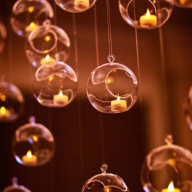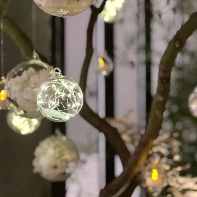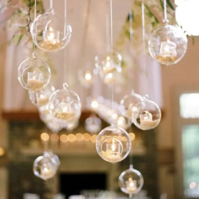 Délicates et aériennes, les boules suspendues créent un jeu de lumière subtil et poétique. Suspendues à différentes hauteurs, elles apportent une touche moderne et raffinée à la scénographie.