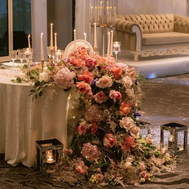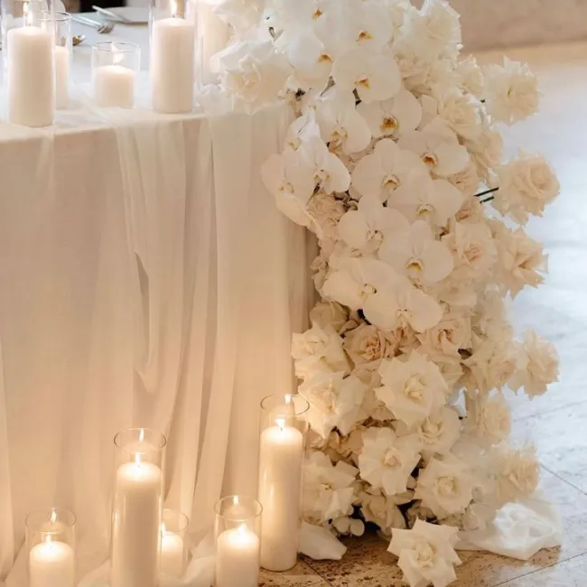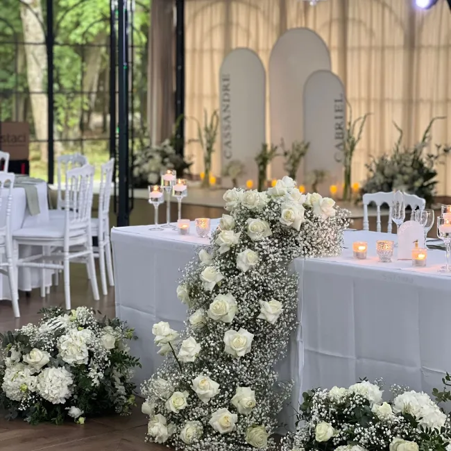 La cascade de fleurs est une pièce qui crée un effet “waouh” inoubliable. Ses fleurs soigneusement agencées donnent l’impression de déborder en douceur, apportant volume, mouvement et romantisme à votre table d’honneur ou à votre scénographie. Une création d’exception pour celles et ceux qui souhaitent une décoration de mariage haut de gamme, élégante et totalement immersive.