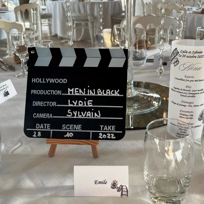 Original et plein de caractère, le clap cinéma transforme le nom de table en véritable élément thématique. Idéal pour un mariage sur le thème du cinéma ou du spectacle, il apporte une touche ludique et personnalisée tout en restant lisible et décoratif.