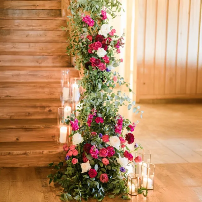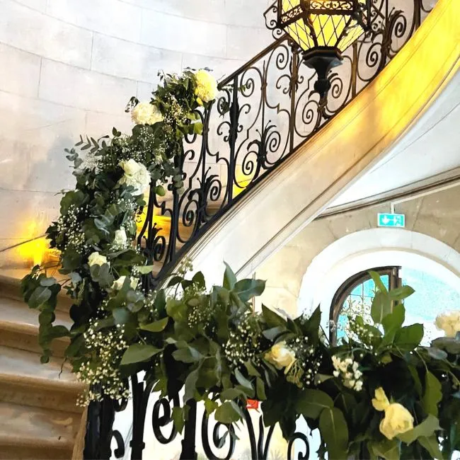 La composition florale d’escalier habille les rampes et garde-corps avec élégance, créant un parcours visuel fort dès l’entrée du lieu de réception. Fleurs et feuillages sont disposés de manière fluide pour accompagner les lignes de l’escalier et apporter une sensation de mouvement et de légèreté.