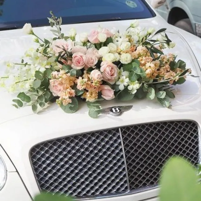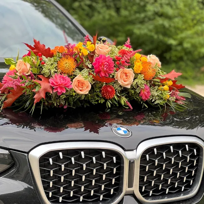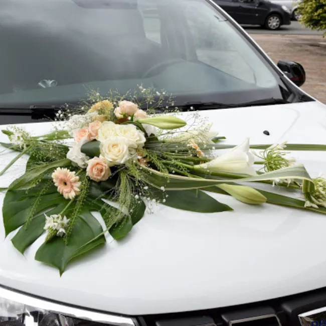 Cette composition florale spécialement conçue pour le capot sublimera votre arrivée avec une touche élégante et romantique. Sa forme allongée et harmonieuse met en valeur des fleurs fraîches soigneusement sélectionnées pour résister au trajet tout en offrant un rendu visuel spectaculaire.