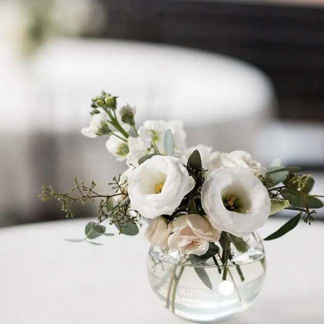Cette composition délicate est idéale pour sublimer vos mange-debout et espaces cocktail. Un mélange raffiné de fleurs et de feuillage apporte douceur et élégance, créant une ambiance accueillante et harmonieuse. Discrète mais impactante, elle s’intègre parfaitement aux mariages modernes, minimalistes ou romantiques, tout en ajoutant une touche florale naturelle.