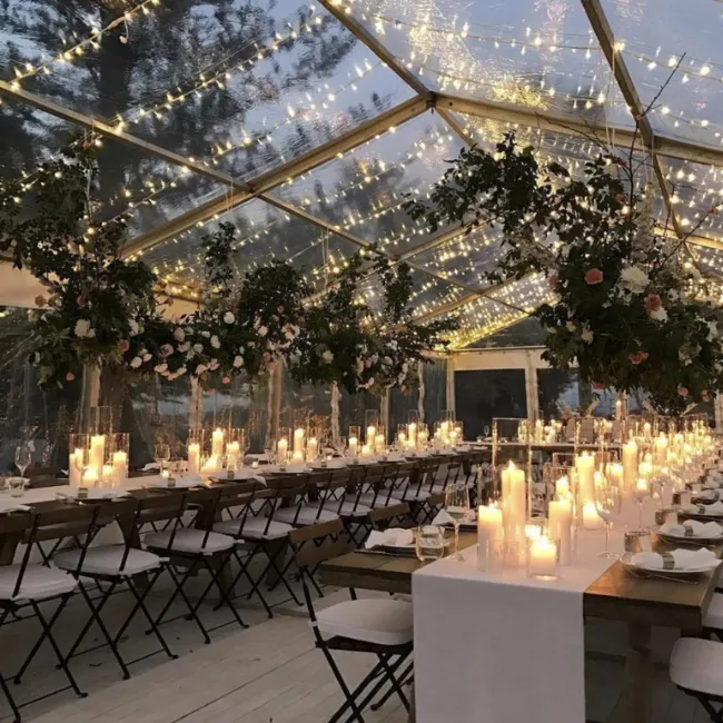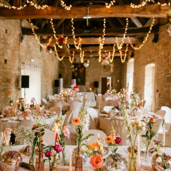 Idéales pour structurer l’éclairage d’une grande salle ou d’un espace extérieur, les guirlandes lumineuses permettent de créer une ambiance enveloppante et élégante.