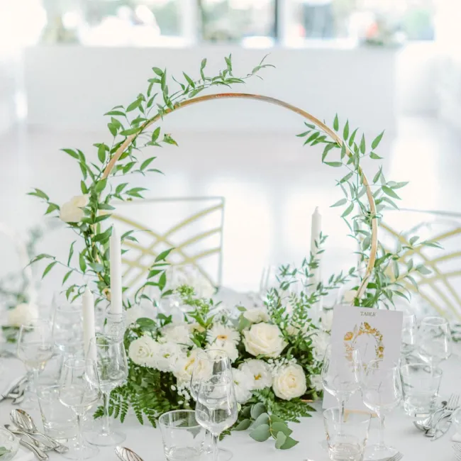 Le Cercle Doré est une pièce décorative raffinée qui apporte une touche moderne et aérienne à vos centres de table. Sa structure fine en métal doré met parfaitement en valeur vos compositions florales, tout en créant un joli jeu de volumes sans surcharger la table.