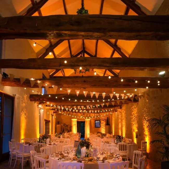 La lumière murale permet de sublimer les murs et de créer une ambiance enveloppante. Grâce à des projecteurs LED sans fil, elle apporte une mise en lumière élégante et modulable, idéale pour structurer la salle et renforcer l’atmosphère de l’événement.