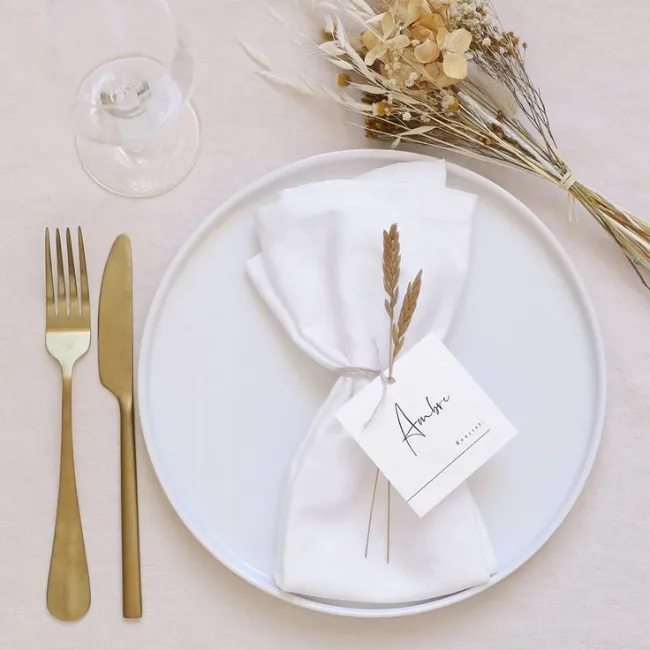 Simple et intemporel, le marque-place carte s’adapte à toutes les ambiances. Posé sur l’assiette ou la table, il permet d’orienter les invités tout en restant discret et élégant. Son format personnalisable offre une grande liberté de création pour s’accorder parfaitement au thème du mariage.