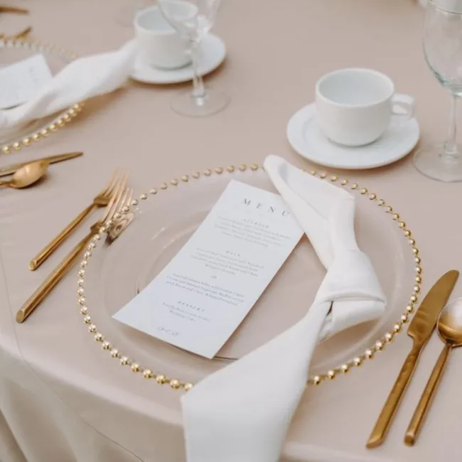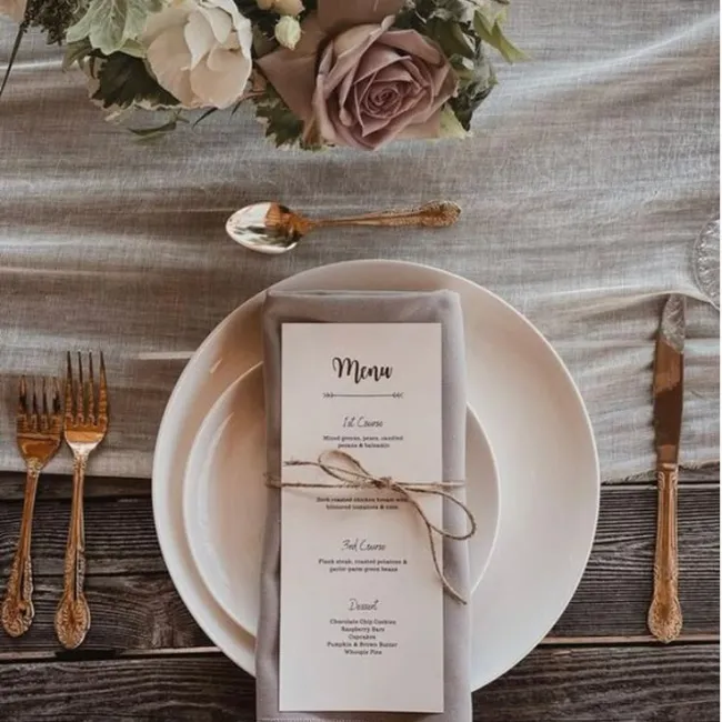 Pensée pour être disposée directement dans l’assiette ou sur la serviette, la carte menu individuelle apporte une attention personnalisée à chaque invité. Elle renforce l’expérience de table tout en participant à la cohérence visuelle de la décoration. Un choix idéal pour les mariages élégants où chaque détail compte.