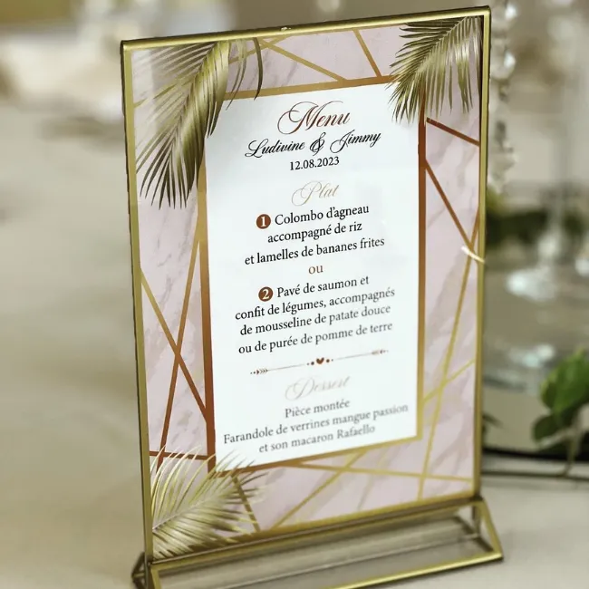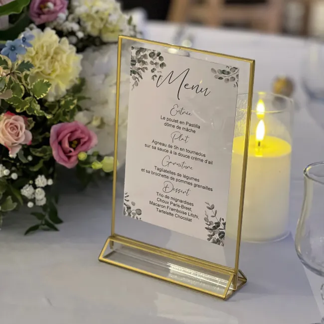 Présenté sur un support élégant, ce menu de table permet de mettre en valeur le déroulé du repas tout en structurant la décoration. Placé au centre de la table ou sur un buffet, il attire naturellement le regard et s’intègre harmonieusement à l’univers du mariage. Son format vertical apporte de la lisibilité et une touche soignée, idéale pour une réception chic, classique ou romantique.