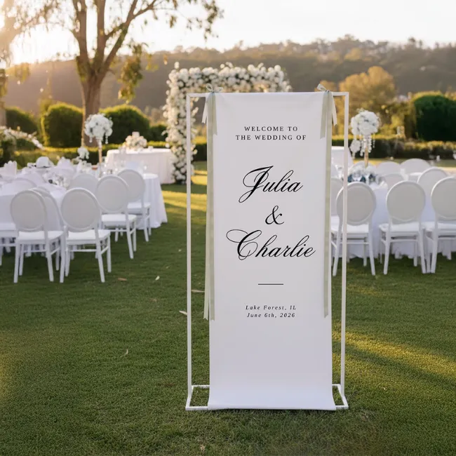 Accueillez vos invités avec un panneau de bienvenue élégant en tissu personnalisé, idéal pour un rendu moderne, chic et intemporel.