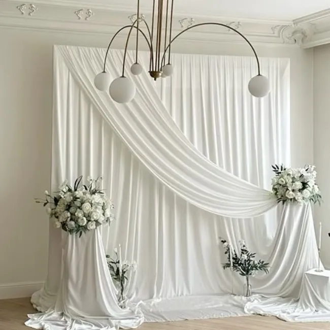 Son tissu léger apporte une atmosphère douce, lumineuse et romantique, tout en donnant du relief à la décoration sans alourdir la scénographie. Utilisé seul ou associé à des compositions florales, des structures ou des éléments lumineux, il s’intègre harmonieusement dans une décoration chic, bohème ou intemporelle.