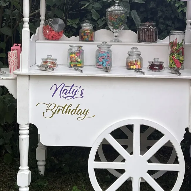 Le sticker personnalisé permet d’apporter une touche unique à votre charrette ou à votre candy bar. Il personnalise instantanément l’espace et renforce la cohérence de la décoration avec le thème de l’événement.