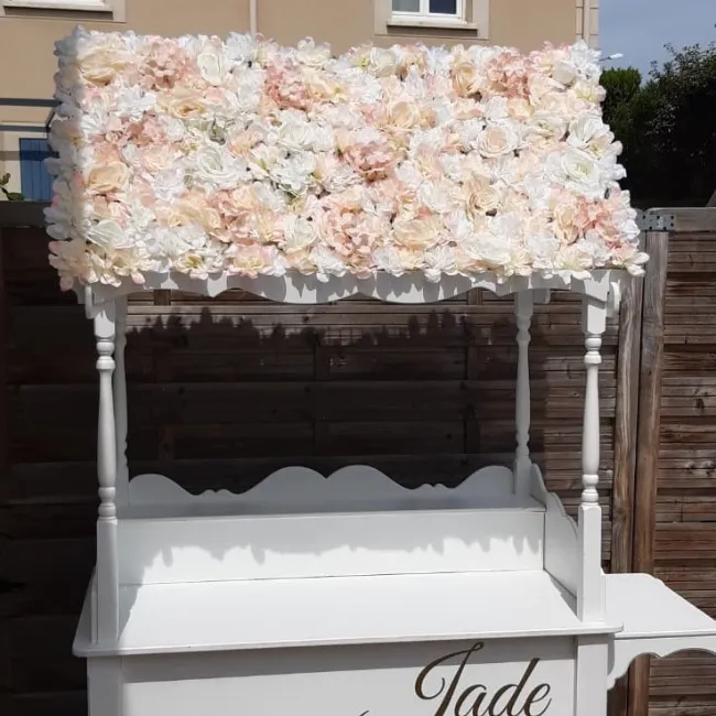 Avec ses teintes naturelles et élégantes, le toit fleuri nude apporte une finition raffinée à la charrette candy bar. Il s’intègre parfaitement dans une décoration chic, bohème ou minimaliste, tout en mettant en valeur l’espace gourmand.